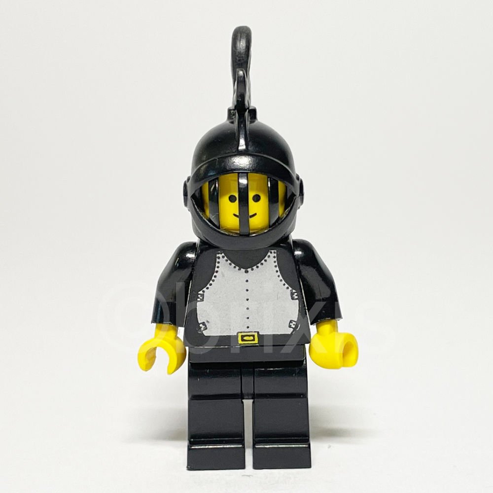 - Kopfbedeckung: Schwarzer Helm mit festem Gesichtsgitter, der den Kopf einer Minifigur umschließt und durch seine geschlossene Form an mittelalterliche Ritterrüstungen erinnert.