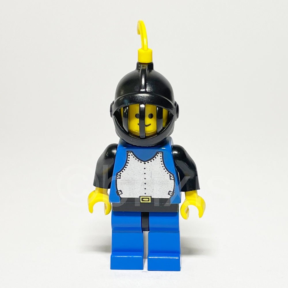 Die Minifigur zeichnet sich durch ihren blauen Torso mit einer silbernen Brustpanzer-Rüstung aus, die von einem schwarzen Gürtel mit gelber Schnalle ergänzt wird. Die schwarzen Arme und gelben Hände verleihen der Figur einen klassischen Look. Der gelbe Kopf mit einem freundlichen Lächeln und der schwarze Helm mit geschlossener Gesichtsmaske und Gitterstruktur unterstreichen das robuste Design. Ein schlichtes schwarzes Cape und eine gelbe Feder als Schmuckelement runden das Erscheinungsbild ab.