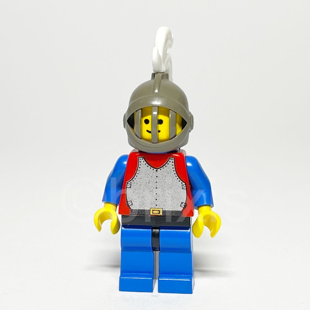 Die Minifigur zeichnet sich durch ihren roten Torso mit silberner Brustpanzerung aus, die im Ritterstil gehalten ist und von einem schwarzen Gürtel mit gelber Schnalle ergänzt wird. Die blauen Arme und gelben Hände harmonieren mit dem schlichten blauen Umhang, der aus Kunststoff gefertigt ist. Der dunkelgraue Helm mit geschlossener Front und integrierter Gesichtsgrille verleiht der Figur ein markantes mittelalterliches Aussehen. Der gelbe Kopf mit einem Standard-Grinsen rundet das Erscheinungsbild ab, während die schwarzen Hüften und blauen Beine eine klassische Schlichtheit bewahren.