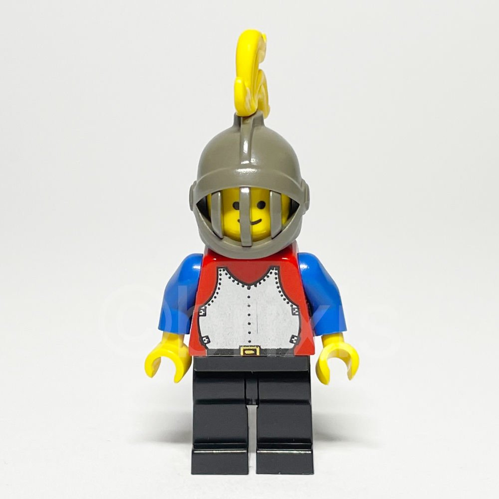 Die Minifigur zeichnet sich durch ihren roten Torso mit einer silbernen Brustpanzerung im Ritterstil aus, die durch einen schwarzen Gürtel mit gelber Schnalle ergänzt wird. Die blauen Arme und gelben Hände verleihen der Figur einen lebendigen Kontrast. Ein dunkelgrauer Helm mit geschlossener Front und integrierter Gesichtsgrille unterstreicht das mittelalterliche Design. Der gelbe Kopf mit einem Standard-Grinsen verleiht der Figur einen freundlichen Ausdruck, während das gelbe Teil mit dreifachem Federbusch eine auffällige Note hinzufügt. Schwarze Hüften und Beine runden das schlichte, aber elegante Erscheinungsbild ab.