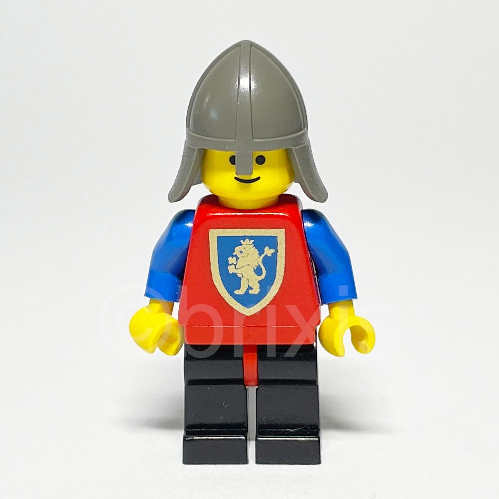 Die Minifigur zeichnet sich durch ihren roten Torso aus, der mit einem goldenen Löwenschild-Muster verziert ist, einem Symbol der Stärke und des Mutes. Die blauen Arme und gelben Hände ergänzen das Design harmonisch. Der dunkelgraue Helm mit Nasenschutz und schräg verlaufendem Nackenschutz verleiht der Figur einen authentischen mittelalterlichen Look. Der gelbe Kopf mit einem klassischen, freundlichen Lächeln und die roten Hüften mit schwarzen Beinen setzen markante Akzente.