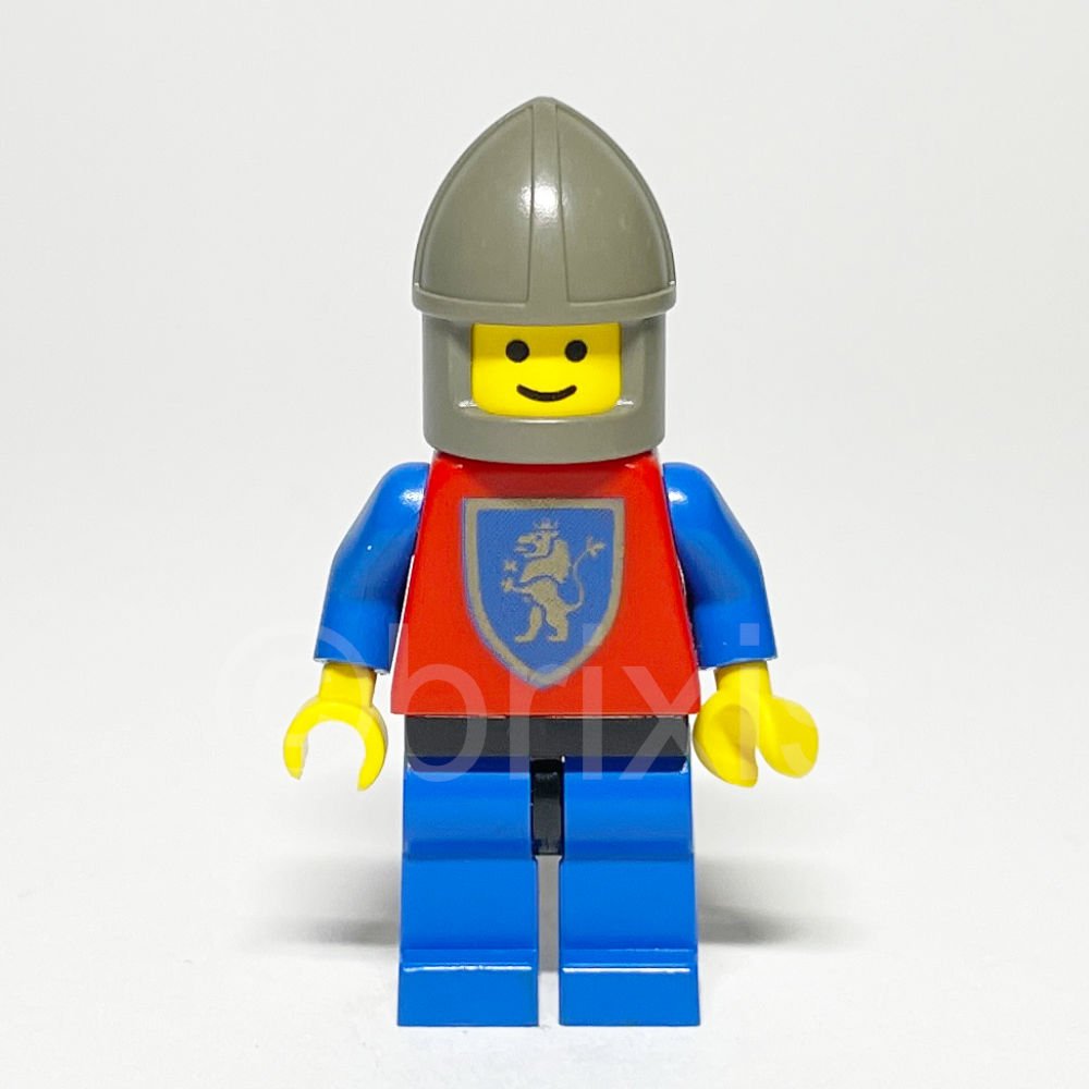 Die Minifigur zeichnet sich durch ihren roten Torso aus, der mit einem goldenen Löwenschild verziert ist, ein Symbol der Stärke und des königlichen Schutzes. Die blauen Arme und gelben Hände ergänzen das Design und verleihen der Figur einen lebendigen Kontrast. Der dunkelgraue Helm im Burgstil, komplett mit Kinnschutz, verstärkt den robusten und klassischen Look. Der gelbe Kopf mit einem Standard-Grinsen verleiht der Figur einen fröhlichen Ausdruck, während die schlichten schwarzen Hüften und blauen Beine die klassische Ästhetik abrunden.