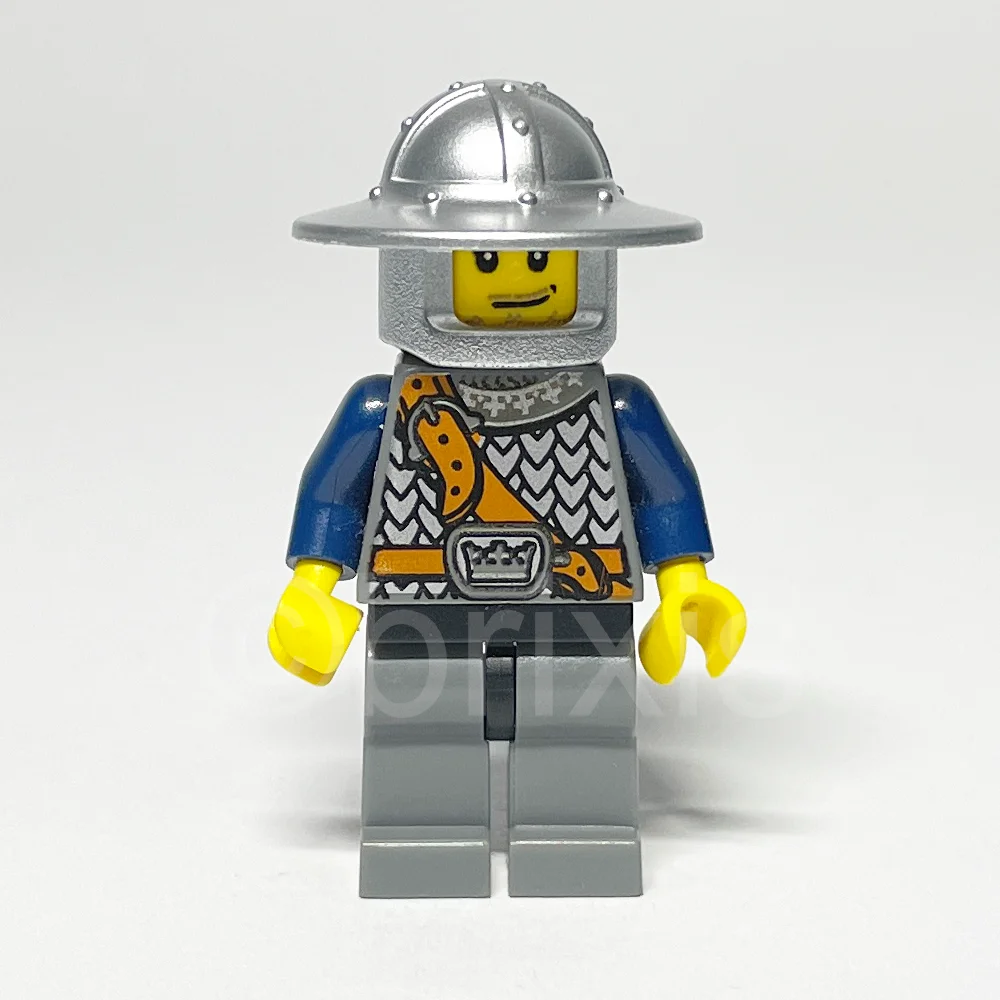 Die Minifigur besticht durch ihren dunkelgrauen Torso, der mit einer silbernen Schuppenpanzerung und einem goldenen Kragen verziert ist. Ein auffälliger dunkelorangener Schulterriemen mit Gürtel und Kronenmuster ergänzt das Design. Die dunkelblauen Arme und gelben Hände verleihen der Figur zusätzliche Authentizität. Der metallisch silberne Helm mit breiter Krempe und Kinnschutz erinnert an klassische Kesselhelme, während der gelbe Kopf mit verschmitztem Lächeln, Bartstoppeln und Koteletten den Charakter der Figur unterstreicht.