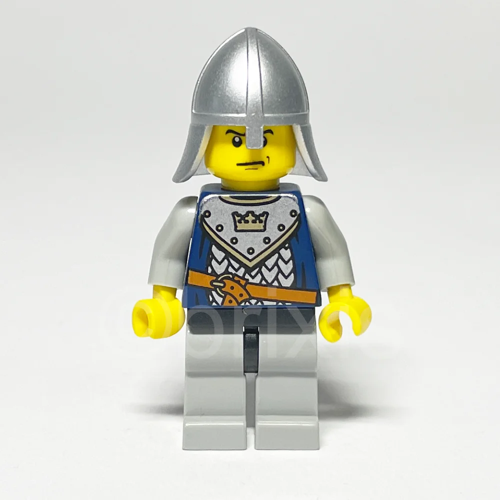 Die Minifigur zeichnet sich durch einen dunkelblauen Torso aus, der mit einem Schuppenpanzer und einem Kronenmuster am Kragen verziert ist, was sie zu einem markanten Vertreter der Fantasy-Ära macht. Die hellgrauen Arme und gelben Hände ergänzen das Design, während der gelbe Kopf mit wütenden Augenbrauen und einem finsteren Stirnrunzeln den kämpferischen Ausdruck unterstreicht. Der metallische Silberhelm mit Nasen- und Nackenschutz verleiht der Figur einen klassischen, mittelalterlichen Look. Die schlichten schwarzen Hüften und hellblaugrauen Beine bieten einen kontrastreichen Abschluss.