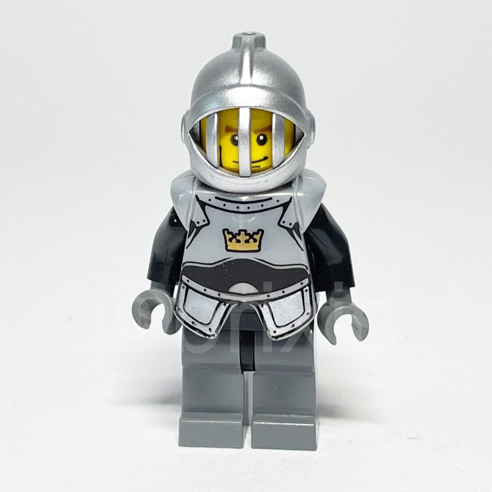 Die Minifigur besticht durch ihren schlichten schwarzen Torso ohne Aufdruck, der durch schwarze Arme und dunkel bläulich-graue Hände ergänzt wird. Besonders auffällig ist der perlgraue Brustpanzer mit Beinschutz, der ein fantasievolles Kronenmuster zeigt und an eine vergangene Ära erinnert. Das gelbe Gesicht der Figur ist mit dicken, rötlich-braunen Augenbrauen, schwarzen Wangenlinien und einem markanten Kinngrübchen versehen, was dem Charakter einen verschmitzten Ausdruck verleiht. Komplettiert wird das Erscheinungsbild durch einen metallisch silbernen Helm mit geschlossenem Visier und integrierter Gesichtsgitterstruktur, die an eine Burg erinnert.