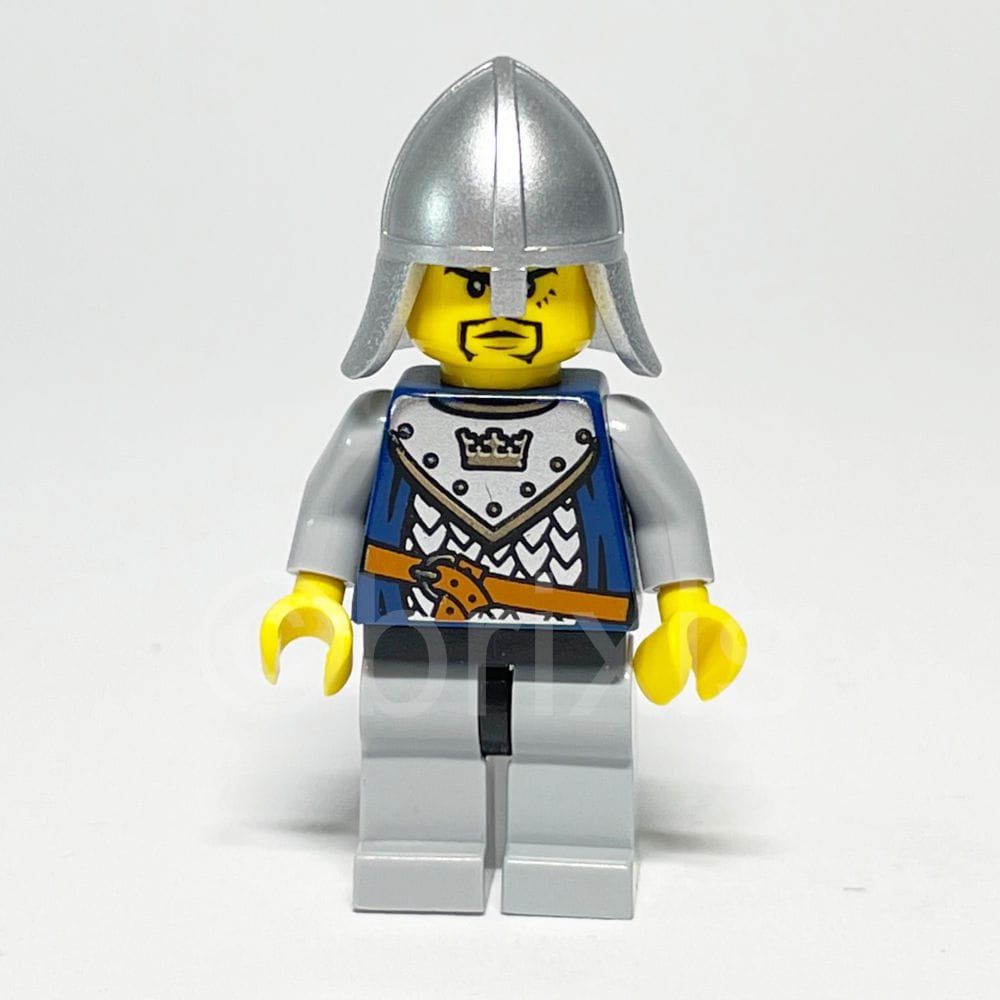 - Torso: Dunkelblauer Torso mit Schuppenpanzer-Muster und einer Krone am Kragen, ergänzt durch hellgraue Arme und gelbe Hände, verleiht der Figur ein mittelalterliches Erscheinungsbild.