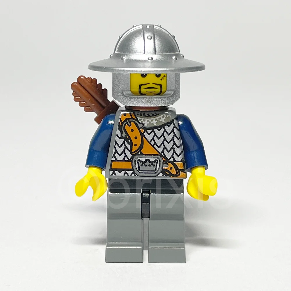 Die LEGO Castle Minifigur Fantasy Era (CAS361) gehört zur Themenwelt Castle und erschien 2007 im Set King’s Castle Siege. Die Figur trägt einen dunkelgrauen Torso mit silberner Schuppenpanzerung und goldenem Kragen, einen metallisch silbernen Helm sowie einen rötlich-braunen Köcher, ergänzt durch schwarze Hüften und dunkel-bläulich-graue Beine.