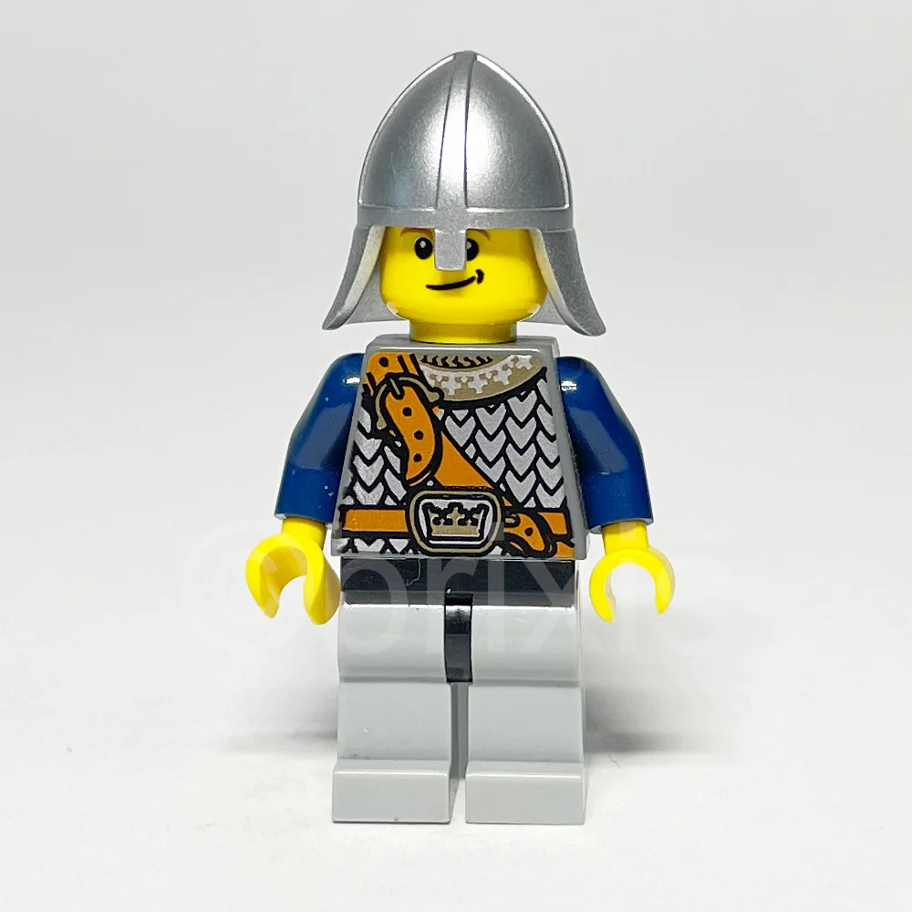 Die Minifigur besticht durch ihren dunkelbläulich-grauen Torso, der mit einer silbernen Schuppenpanzerung verziert ist. Ein goldener Kragen und ein dunkelorangener Schulterriemen mit einem Kronenmuster auf dem Gürtel verleihen der Figur einen majestätischen Look. Der metallisch silberne Helm mit Nasen- und Nackenschutz erinnert an klassische Burghelme und verstärkt den mittelalterlichen Charakter. Der Kopf der Figur ist gelb mit rötlich-braunen Augenbrauen und einem schiefen Lächeln, das durch ein schwarzes Grübchenmuster ergänzt wird.
