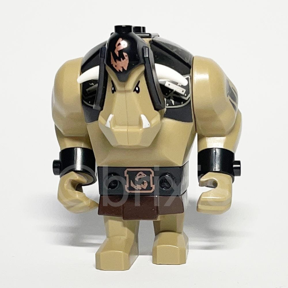 Die Gestaltung der Minifigur ist besonders markant durch ihre dunkelbeigen Trollarme, die jeweils mit einem schwarzen Armband verziert sind, das ein Totenkopf-Muster zeigt. Der riesige Körper des Trolls ist mit einem schwarzen Rüstungsmuster versehen, das seine bedrohliche Präsenz unterstreicht. Die beiden Trollhände sind mit Technic-Pins ausgestattet, die vielseitige Verbindungsmöglichkeiten bieten. Ein weiteres Detail ist der blaue Technic-Achsstift mit Reibungsrillen, der für einen festen Halt sorgt. Die kleine weiße Kralle, Zahn oder Horn, schlicht und sauber gestaltet, rundet das Erscheinungsbild ab.