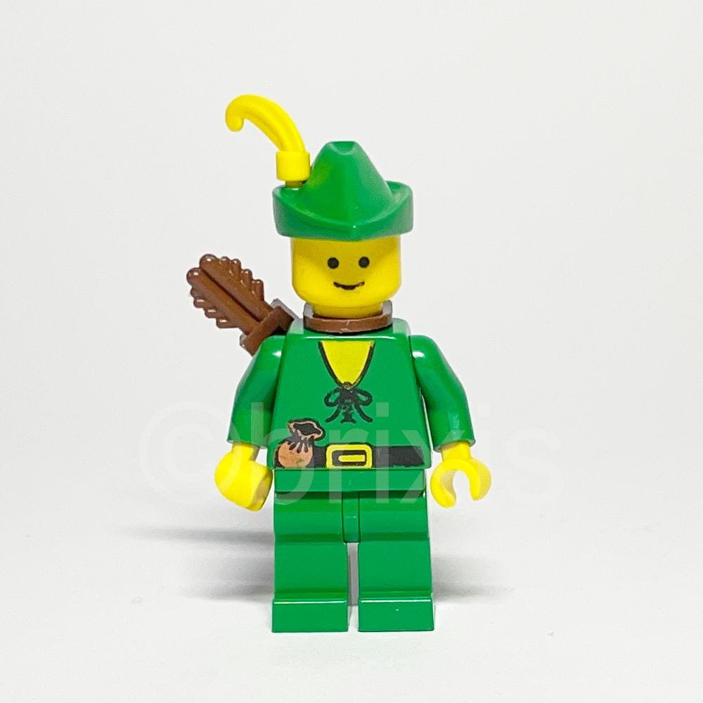 Die Gestaltung der Minifigur ist durch ihren grünen Torso mit einem detaillierten Waldläuferhemd geprägt, das mit Schnürungen und einem schwarzen Gürtel mit Schnalle versehen ist. Eine braune Tasche und ein gelbes Halsmuster vervollständigen das Outfit. Der braune Köcher mit zwei Pfeilen unterstreicht die Funktionalität der Figur, während die gelbe kleine Feder am Bycocket-Hut einen farbenfrohen Akzent setzt. Der gelbe Kopf mit einem Standard-Grinsen verleiht der Figur einen fröhlichen Ausdruck.
