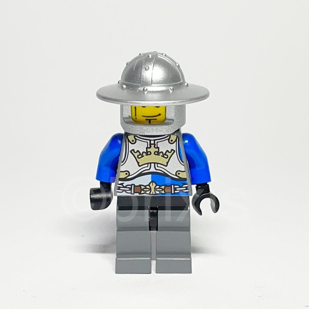 Die Minifigur zeichnet sich durch ihren dunkelgrauen Torso aus, der mit einer prächtigen Ritterbrustplatte verziert ist. Diese zeigt eine Krone und ein Kettenmuster, das die edle Herkunft des Ritters unterstreicht. Die blauen Arme und schwarzen Hände ergänzen das Design harmonisch. Besonders auffällig ist das gelbe Gesicht mit rötlich-braunen Augenbrauen und einem verschmitzten Lächeln, das durch ein markantes Kinngrübchen betont wird. Der metallisch silberne Helm mit breiter Krempe und Kinnschutz erinnert an das klassische Kesselhelm-Design und verleiht der Figur einen authentischen mittelalterlichen Look.