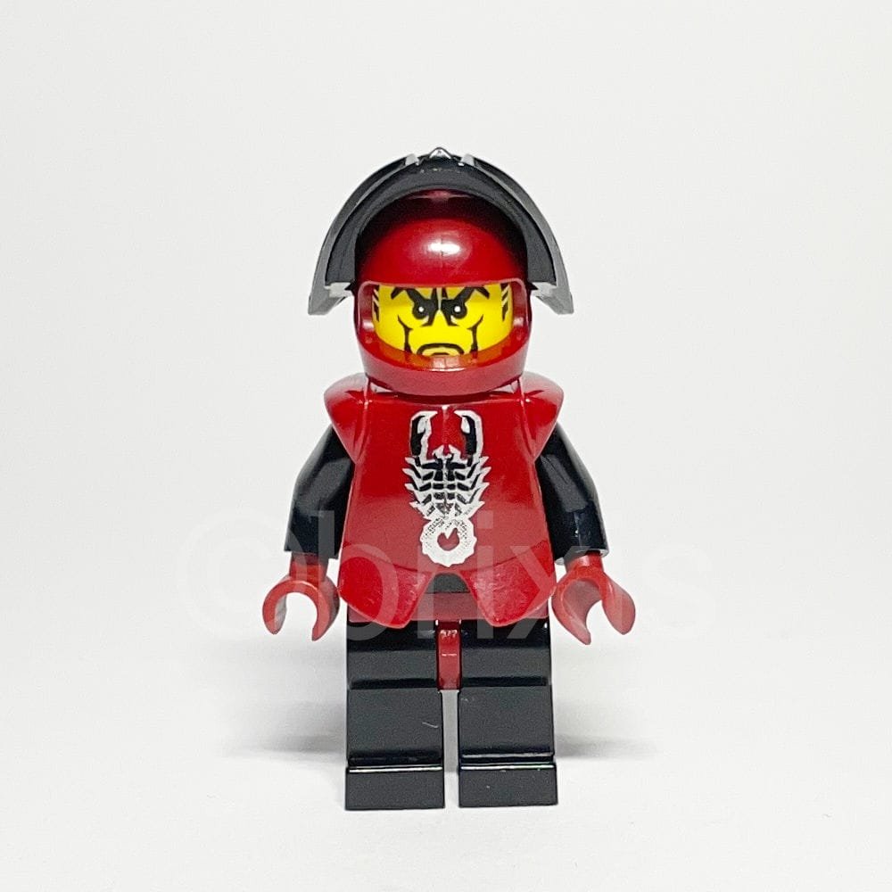 Die LEGO Castle Minifigur Knights Kingdom II (CAS270) gehört zur Themenwelt Castle und erschien 2005 in mehreren LEGO Castle Sets. Die Figur trägt eine dunkelrote Rüstungsbrustplatte mit silbernem Skorpionmuster, einen dunkelroten Motorradhelm und eine schwarze Visierbrille, ergänzt durch einen gelben Kopf mit markantem Gesichtsausdruck.