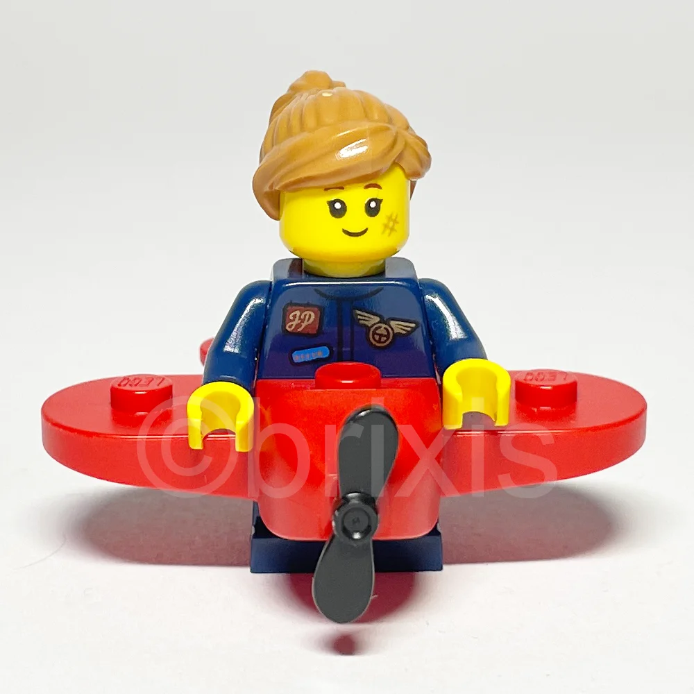 Das Aussehen der Airplane Girl Minifigur ist durch ihren dunkelblauen Overall geprägt, der mit einem rötlich-braunen Namensschild, auf dem in Gold ‚JP‘ steht, und goldenen Flügelabzeichen verziert ist. Ihre kurzen dunkelblauen Beine ergänzen den Look, während der gelbe Kopf mit doppelseitigem Kindergesicht sowohl ein breites Grinsen als auch ein Lächeln mit sichtbaren oberen Zähnen zeigt. Das Haarteil in mittlerem Nougat mit Pferdeschwanz und seitlich geschwungenem Pony verleiht der Figur einen modernen, gepflegten Look. Das rote Kostümflugzeug mit schwarzem Propeller rundet das Design ab und macht die Figur zu einem echten Hingucker.
