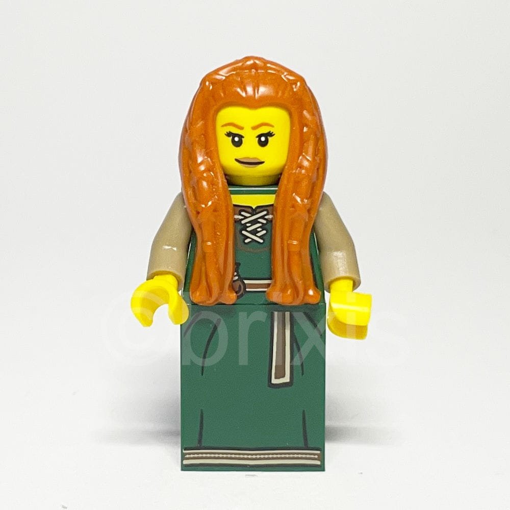 - Kopfbedeckung: Dunkeloranges Haar mit langer, geflochtener Vorderpartie verleiht der Minifigur einen klassischen und zugleich modernen Look.