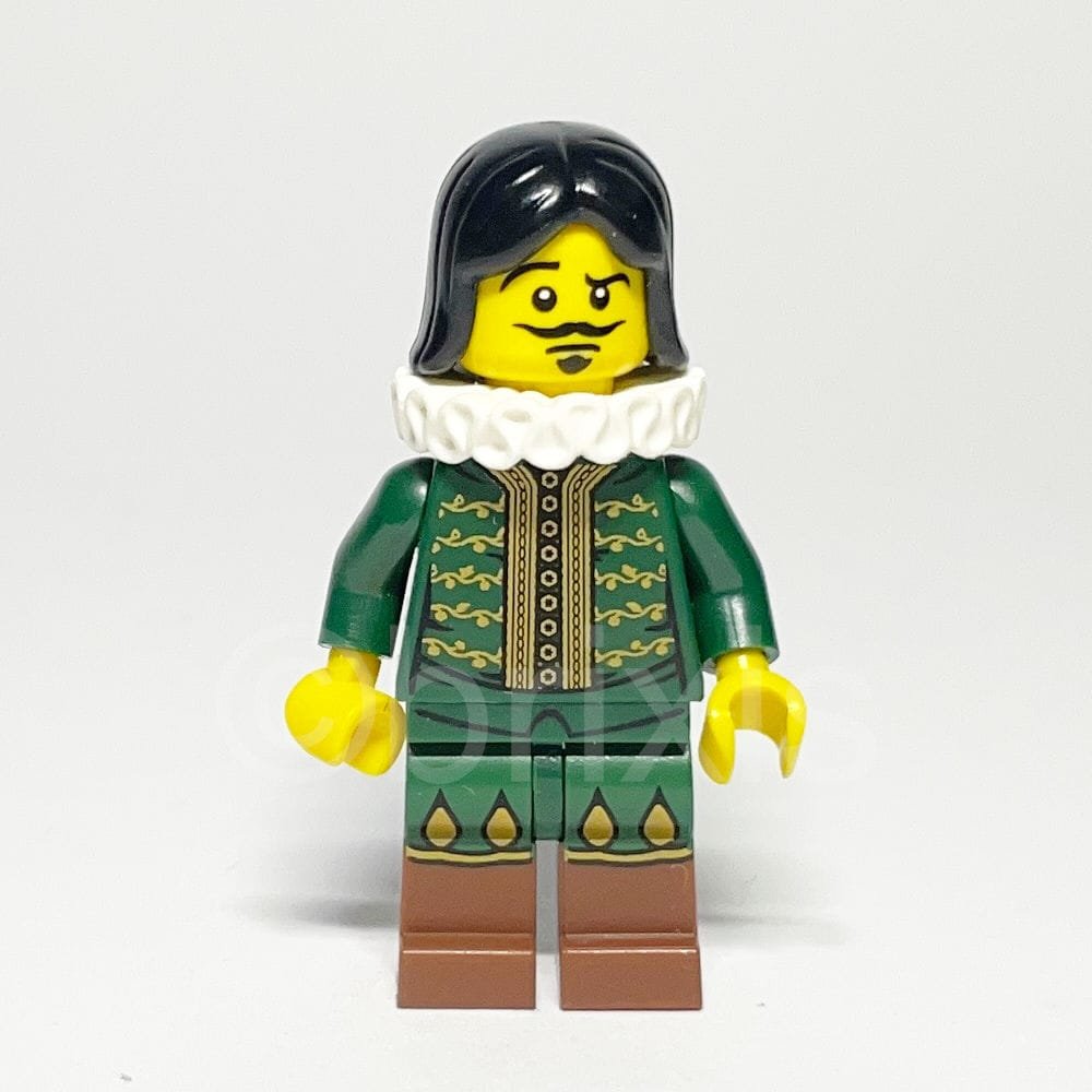 Die Thespian-Minifigur besticht durch ihren dunkelgrünen Torso, der mit goldenen Verzierungen, Knöpfen und einem floralen Motiv bedruckt ist. Die dunkelgrünen Arme und gelben Hände ergänzen das elegante Erscheinungsbild. Besonders auffällig sind die rötlich-braunen Beine mit einer dunkelgrünen Hose, die ebenfalls mit goldenen Verzierungen versehen ist. Der gelbe Kopf zeigt zwei Gesichtsausdrücke: ein schelmisches Lächeln mit Schnurr- und Kinnbart sowie eine hochgezogene Augenbraue auf der einen Seite und einen erschrockenen Ausdruck auf der anderen. Ein schlichtes schwarzes Haarteil und ein voluminöser weißer Rüschenkragen runden das Erscheinungsbild ab.