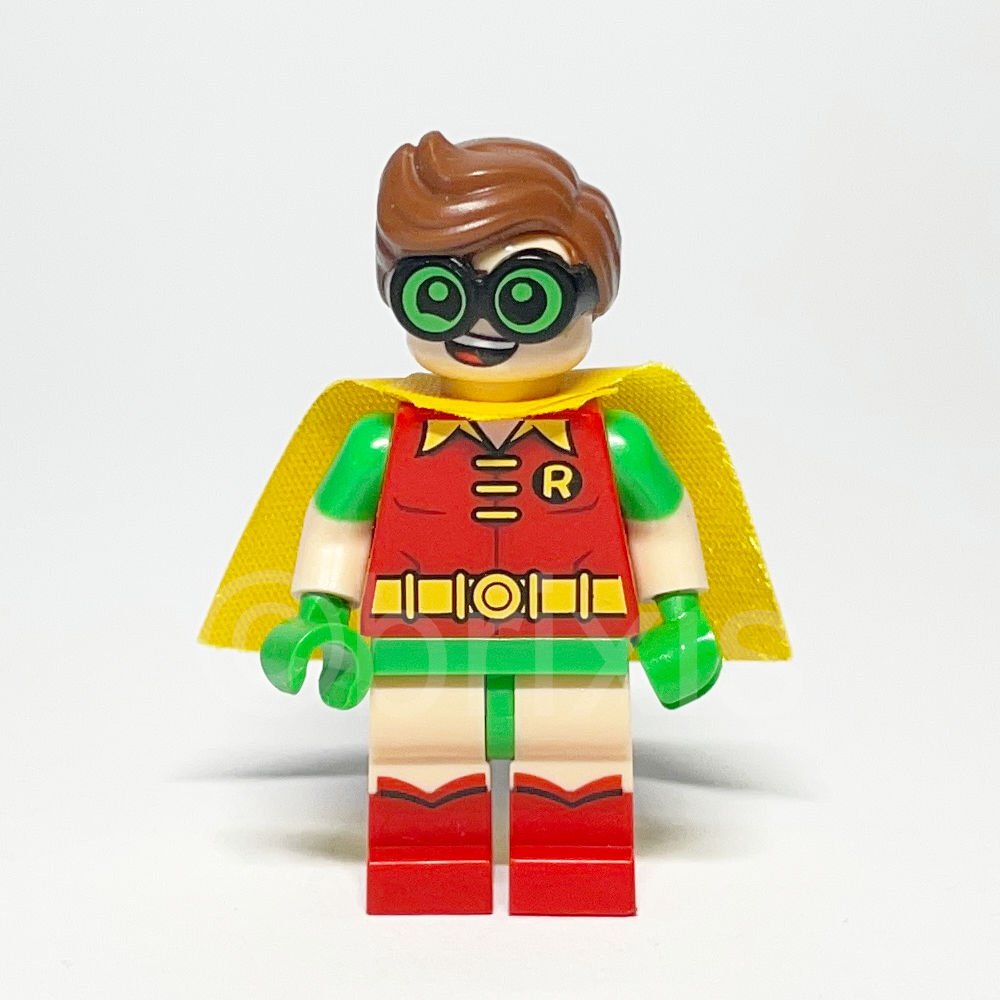 - Torso: Roter Torso mit Batman-'R'-Symbol, drei gelben Verschlüssen, Kragen- und Gürtelmuster, hellen nougatfarbenen Armen mit geformten leuchtend grünen kurzen Ärmeln und leuchtend grünen Händen.