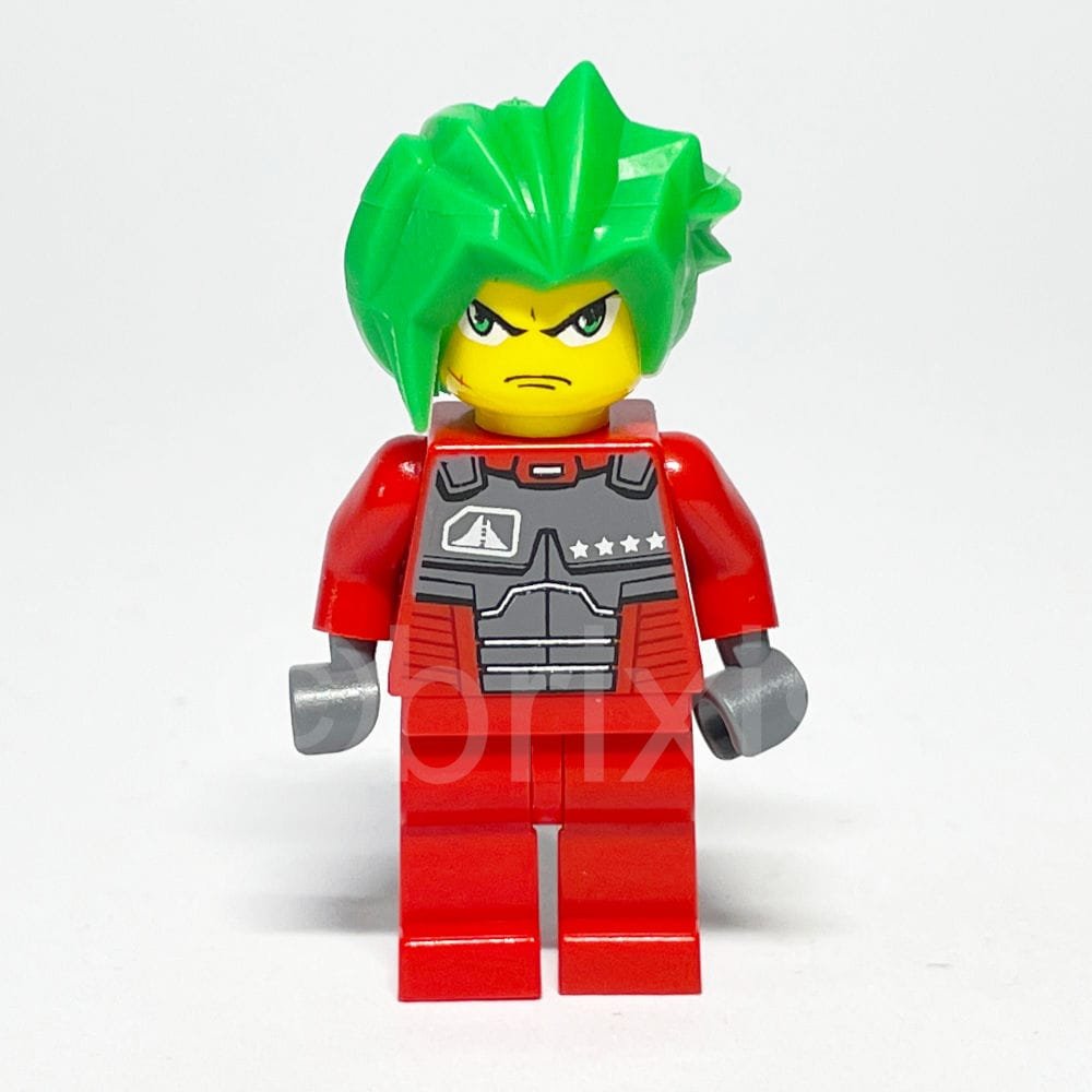 - Kopfbedeckung: Helles grünes Haarteil mit nach hinten geschwungenem, flexiblen Gummi-Design, das der Minifigur einen dynamischen und modernen Look verleiht.