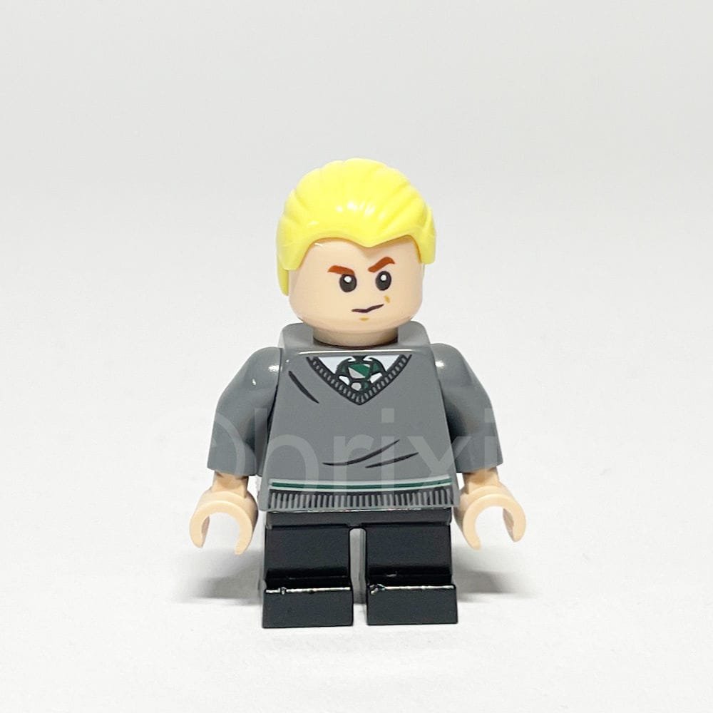 Die Minifigur besticht durch ihren dunkelgrauen Torso, der einen V-Ausschnitt-Pullover mit einem weißen Kragen und einer grün-weiß gestreiften Krawatte im typischen Slytherin-Stil zeigt. Die Haare sind in einem hellen Gelbton gehalten und ordentlich von vorne nach hinten gekämmt. Der Kopf der Figur ist in einem hellen Nougatton gestaltet und zeigt zwei Gesichtsausdrücke: einen misstrauischen Blick mit hochgezogener linker Augenbraue und einen wütenden Ausdruck auf der anderen Seite. Die schlichten schwarzen kurzen Beine runden das Erscheinungsbild ab.