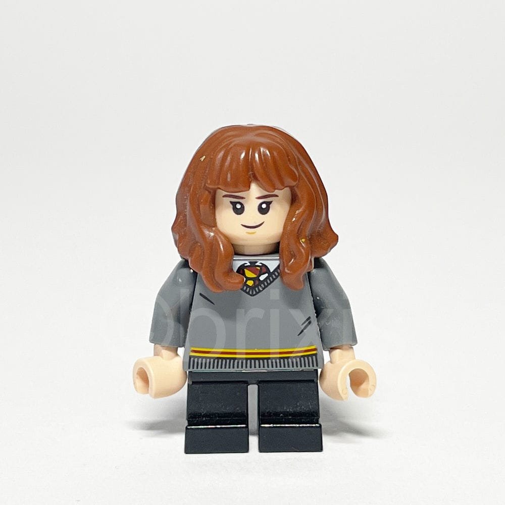 Die Minifigur zeichnet sich durch ihren dunkelgrauen Torso mit einem V-Ausschnitt-Pullover im Gryffindor-Stil aus, der durch eine rote und gelbe Krawatte akzentuiert wird. Ihr Kopf in hellem Nougatton bietet zwei Gesichtsausdrücke: ein breites Grinsen und einen erschrockenen Ausdruck. Das rötlich-braune Haarteil mit mittellangem, welligem Haar verleiht Hermione einen freundlichen und natürlichen Look. Die schlichten schwarzen Beine runden das Erscheinungsbild ab.