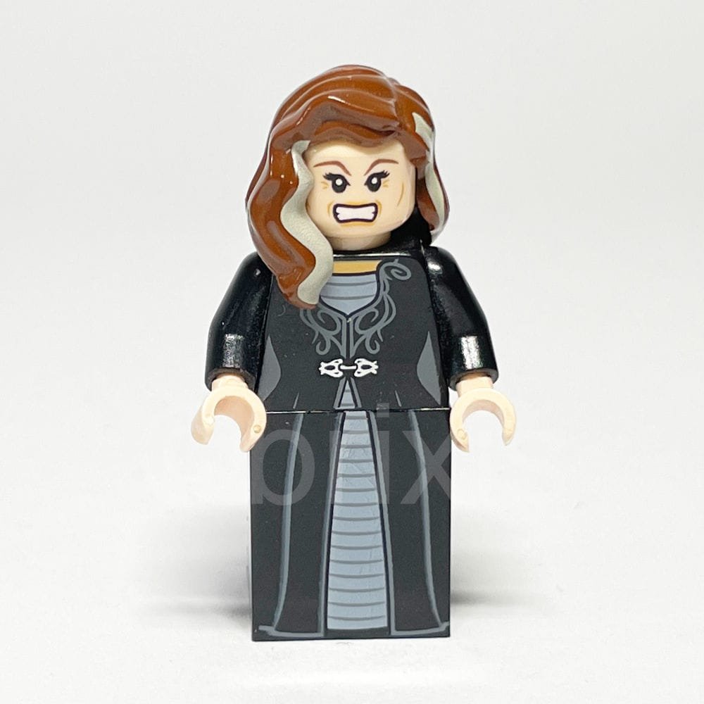 Die Gestaltung der Minifigur ist besonders durchdacht und detailreich. Der schwarze Torso ist mit einem Harry-Potter-Kleid verziert, das dunkel-bläulich-graue Stickereien über einem hell-bläulich-grauen Einsatz zeigt. Diese feinen Details werden durch schwarze Arme und helle Nougathände ergänzt. Der Kopf der Figur ist in einem hellen Nougatton gehalten und bietet zwei Gesichtsausdrücke: ein freundliches Lächeln und einen wütenden Ausdruck. Abgerundet wird das Erscheinungsbild durch ein rötlich-braunes Haarteil mit beigen Highlights, das mittellang über die rechte Schulter fällt.