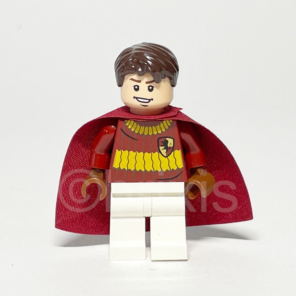 Die Minifigur zeichnet sich durch ihren dunkelroten Torso mit einem gerippten Muster im Gryffindor-Stil aus, der durch dunkelrote Arme und rötlich-braune Hände ergänzt wird. Das dunkelbraune Haarteil, kurz und zerzaust mit einem Seitenscheitel, verleiht Oliver Wood eine lässige und moderne Note. Der dunkelrote Umhang aus Stoff, traditionell gestärkt, unterstreicht seine Rolle als Quidditch-Spieler. Der Kopf der Figur ist in einem hellen Nougatton gehalten, mit rötlich-braunen Augenbrauen und einem schiefen, offenen Lächeln, das seine sportliche und freundliche Persönlichkeit widerspiegelt.