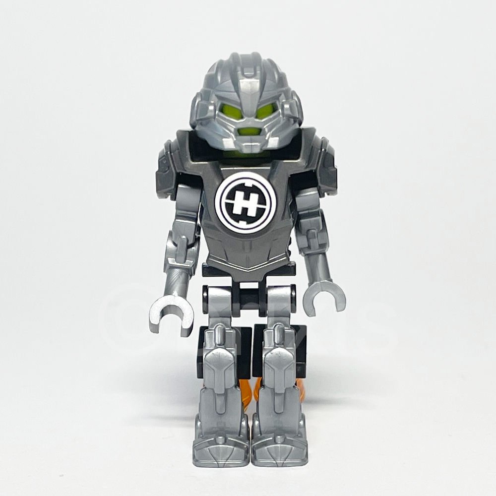 Die Gestaltung der Hero Factory Mini ist geprägt von ihrem mechanischen Erscheinungsbild. Auffällig sind der mechanische Arm und das Bein in flachem Silber, die perfekt zur Hero Factory Serie passen. Der schwarze Skeletttorso mit abgerundeter Rippenstruktur und dicken Schulterstiften verleiht der Figur ein robustes Aussehen. Der Brustpanzer in Perldunkelgrau mit markanten Schulterpolstern und einer Frontniete fügt zusätzliche Details hinzu. Der Helm in flachem Silber rundet das futuristische Design ab und harmoniert mit dem limettengrünen Kopf, der schlicht und sauber gehalten ist.