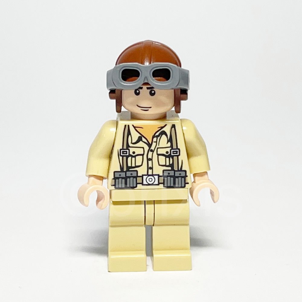 - Kopfbedeckung: Rötlich-braune Fliegermütze, die den Kopf der Minifigur umschließt und mit ihrem klassischen Design an die frühen Tage der Luftfahrt erinnert.