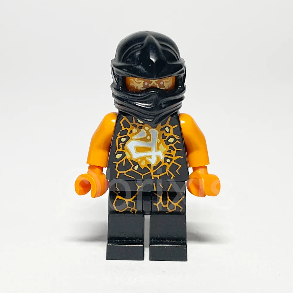 - Torso: Schwarzer Torso mit orangefarbenen Brüchen, goldenen Felsen und weißem Ninjago-Logogramm 'Erde' sowie orangefarbenen Armen und Händen zeigt beeindruckende Details und symbolisiert Stärke.