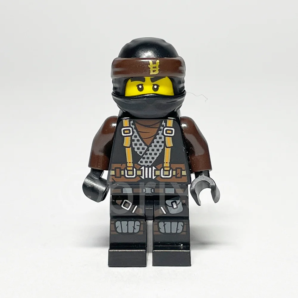 - Torso: Schwarzer Torso mit Ninjago-Robe, versehen mit Hosenträgern und breitem Gürtel sowie einem Drachenlogo auf der Rückseite, ergänzt durch dunkelbraune Arme und schwarze Hände.