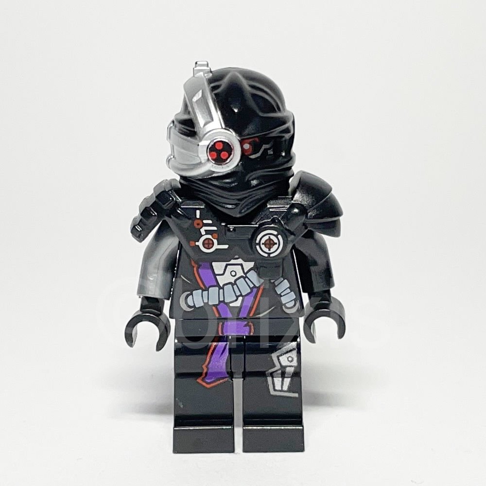 - Kopfbedeckung: Schwarze Ninjago-Kopfbedeckung mit silbernem Cyborg-Augenstück und einem roten Punkt oben sorgt für einen geheimnisvollen und technologisch fortschrittlichen Eindruck.