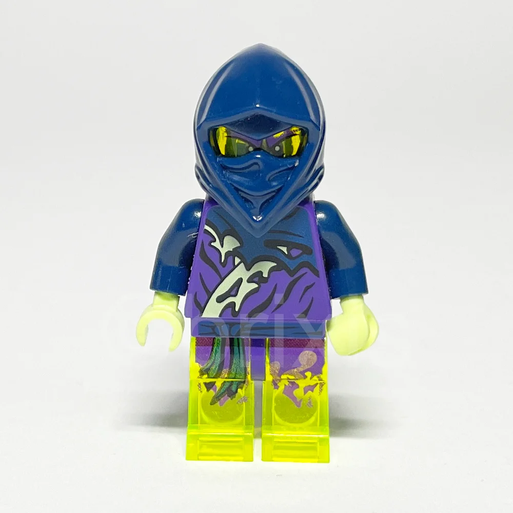 - Torso: Dunkellila Torso mit zerschlissenem dunkelblauem und gelbgrünem Robenmuster, ergänzt durch dunkelblaue Arme und gelbgrüne Hände, die eine dynamische Ninjago-Optik erzeugen.
