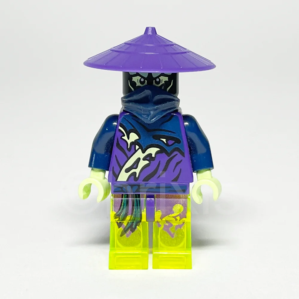- Torso: Dunkellila Torso mit Ninjago-Robenmuster in zerrissenem Dunkelblau und gelblich-grün, ergänzt durch dunkelblaue Arme und gelblich-grüne Hände.