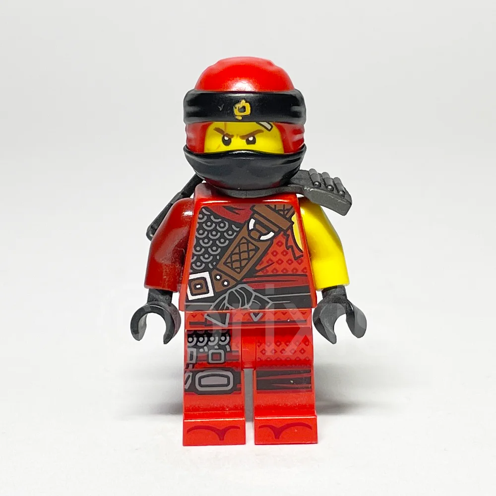 - Torso: Roter Torso mit Ninjago-Rüstung und Kettenhemd, ergänzt durch einen breiten Gürtel in rötlich-braun und eine schwarze Schärpe. Der linke Arm ist gelb, der rechte dunkelrot, beide mit schwarzen Händen.