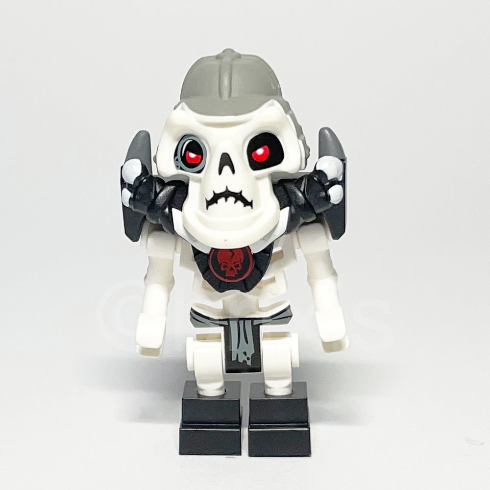- Torso: 2× Weiße Skelettbeine mit schwarzen quadratischen Füßen, die eine gruselige und mechanische Erscheinung am unteren Teil der Minifigur erzeugen.