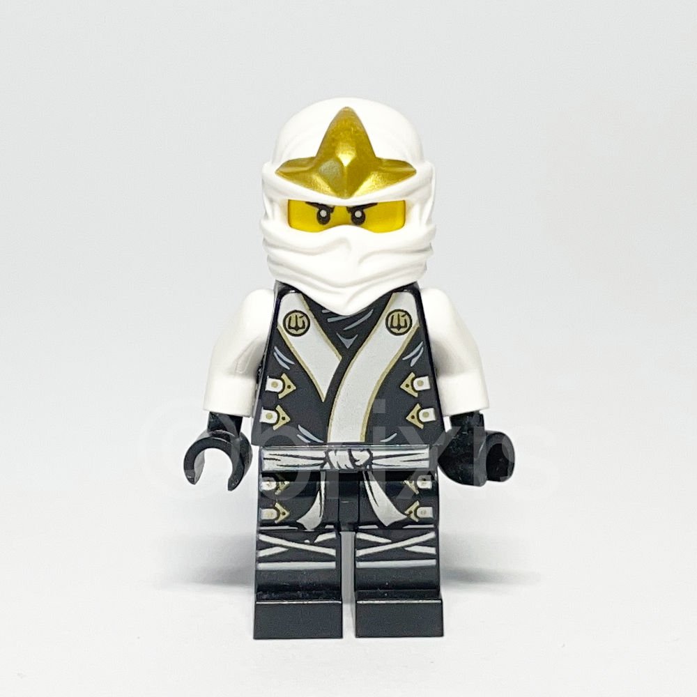 - Torso: Schwarzer Torso mit einem Ninjago-Robenmuster, das eine weiße und goldene Schärpe zeigt, kombiniert mit weißen Armen und schwarzen Händen für einen eleganten und kontrastreichen Auftritt.