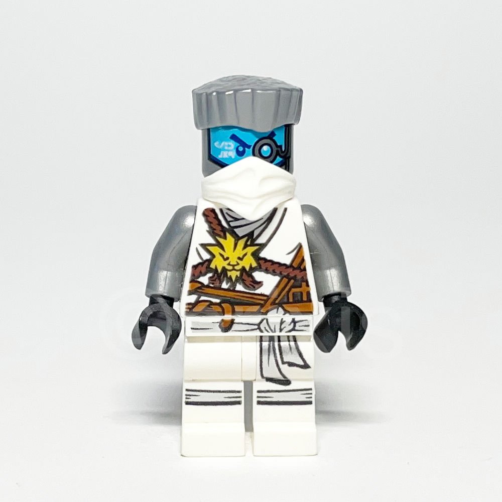 Die Minifigur zeichnet sich durch ihren weißen Torso aus, der mit einem braunen Ninjago-Seil, einem goldfarbenen Medaillon und einem silbernen Unterhemd verziert ist. Auf der Rückseite befindet sich ein Schwertscheidenmuster, das die Figur für actionreiche Szenen prädestiniert. Zanes flaches silbernes Haarteil und das doppelseitige Alien-Roboter-Gesicht mit mittelblauen Augen verleihen ihm einen futuristischen Look. Die weißen Hüften und Beine mit silbernem Band und Knieschlaufenmuster unterstreichen seinen markanten Auftritt.
