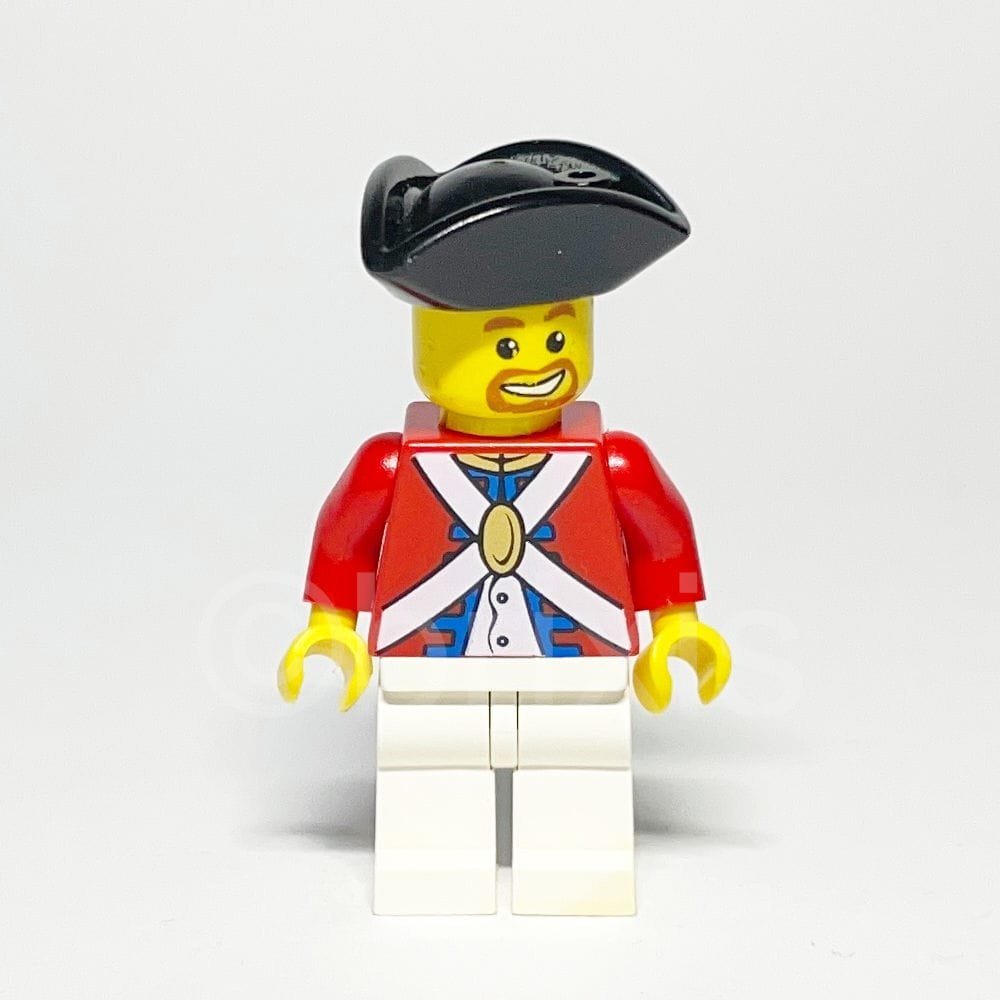 Die Minifigur besticht durch ihren roten Torso, der eine imperial gestaltete Soldatenuniformjacke zeigt. Diese ist mit blauen und goldenen Verzierungen über einem weißen Hemd mit Knöpfen versehen. Besonders hervorzuheben sind die bedruckten Schulterriemen mit ovaler Schnalle und der dunkelbraune Munitionsbeutel auf der Rückseite. Der gelbe Kopf der Figur zeigt dunkelorangene Augenbrauen, einen markanten Schnurr- und Kinnbart sowie ein schiefes Lächeln mit sichtbaren Zähnen. Abgerundet wird das Erscheinungsbild durch einen schwarzen Piraten-Dreispitz und schlichte weiße Beine.
