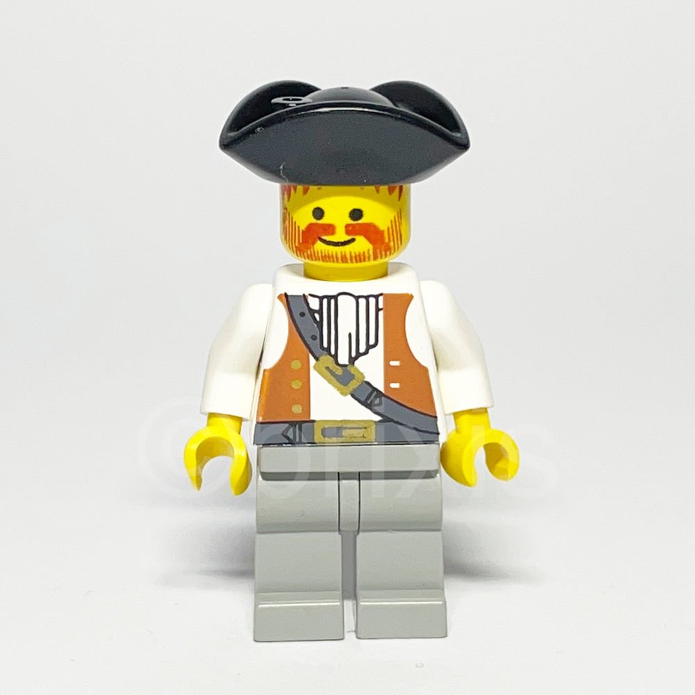 - Torso: Weißer Torso mit brauner Weste und goldenen Knöpfen, verziert mit dunklen Gürteln und gelben Händen, ideal für Piratenfiguren.