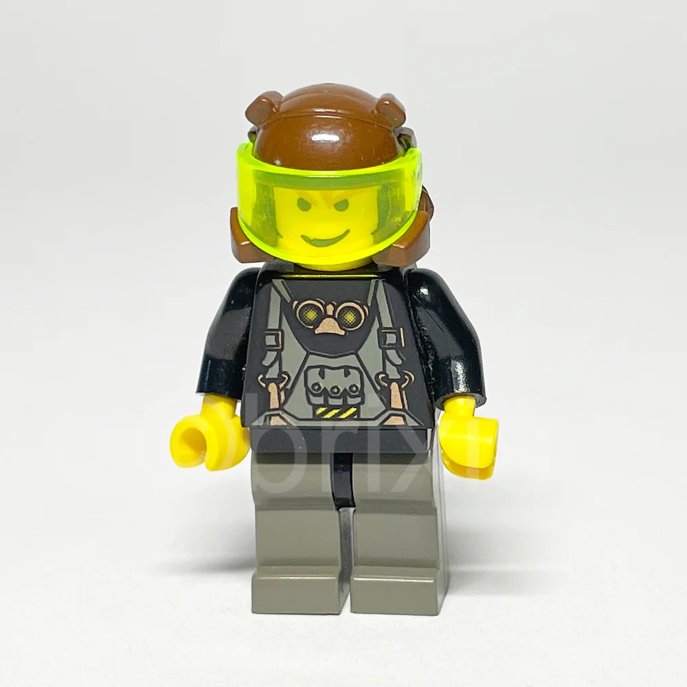 Axel besticht durch seinen markanten Look, der ihn sofort erkennbar macht. Sein schwarzer Torso ist mit einem dunkelgrauen Overall im typischen Rock-Raiders-Stil gestaltet, der durch kupferfarbene Schnallen und eine Tasche hervorgehoben wird. Ein Aufnäher mit einem Warnstreifenmuster verleiht ihm eine authentische Note. Der braune Helm mit Atemgerät und Scheinwerfern unterstreicht seine Funktionalität, während das schelmische Lächeln auf seinem gelben Gesicht mit orangefarbenen Augenbrauen und schwarzen Koteletten seinen Charakter perfekt einfängt. Abgerundet wird das Erscheinungsbild durch ein durchscheinendes neongrünes Visier, das Axels Abenteuerlust symbolisiert.