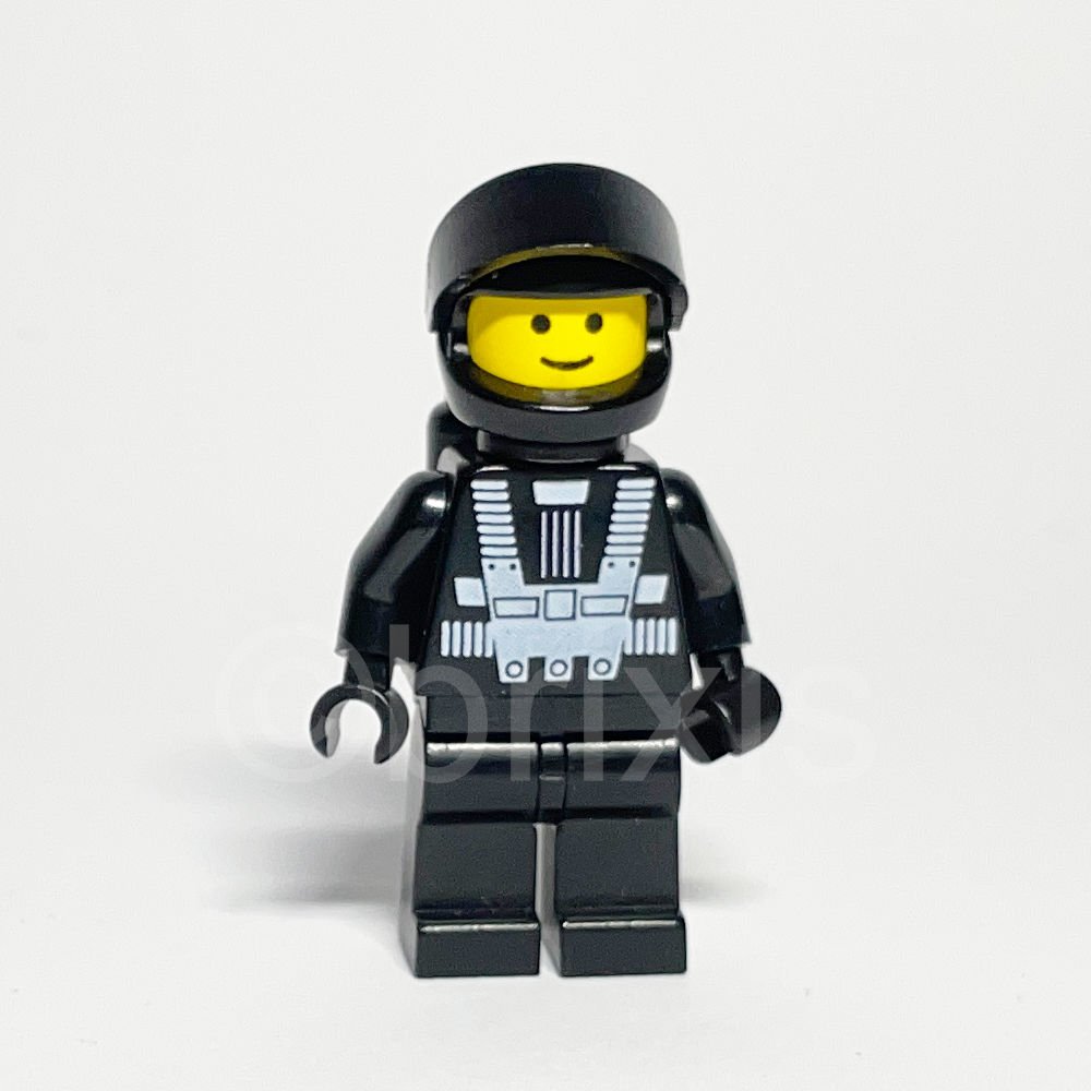 Die Gestaltung der Blacktron I Minifigur ist durch ihren schwarzen Torso mit Raumanzug-Bedruckung geprägt, der durch einen weißen Gurt und ein Brustpaneel mit Nieten ergänzt wird. Der gelbe Kopf zeigt ein klassisches, freundliches Lächeln, das den Charakter der Figur unterstreicht. Die schwarzen Hüften und Beine sind schlicht und sauber gehalten, während die schwarzen Lufttanks eine glatte und robuste Oberfläche aufweisen. Abgerundet wird das Erscheinungsbild durch einen schwarzen Motorradhelm mit einem schwarzen Visier, das schlicht und markant gestaltet ist.