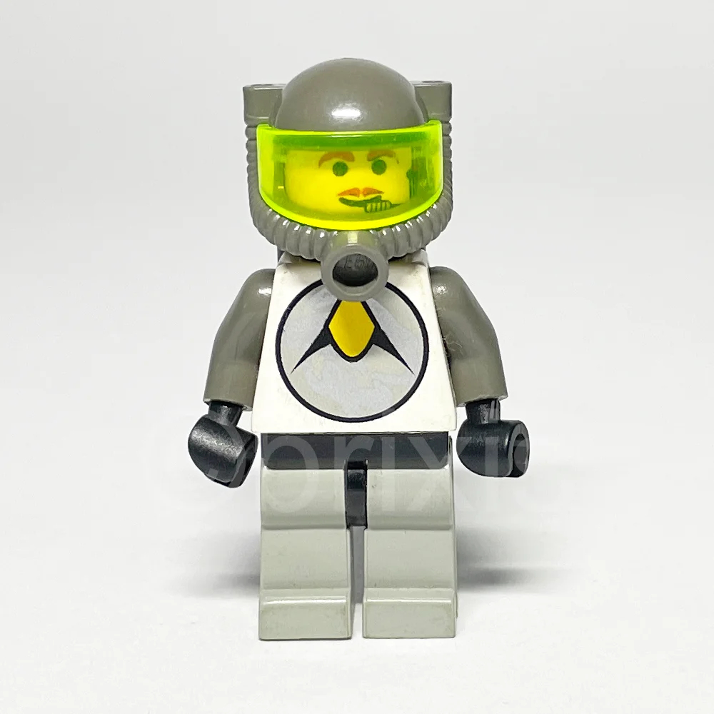 Die Minifigur zeichnet sich durch ihren weißen Torso mit dem markanten Space Exploriens Logo aus, das von dunkelgrauen Armen und schwarzen Händen ergänzt wird. Der dunkelgraue Helm mit integriertem Atemschlauch ist ideal für Raumfahrt-Missionen. Besonders auffällig ist der gelbe Kopf mit einem roten Schnurrbart, einem Headset und markanten roten Augenbrauen, die der Figur einen unverwechselbaren Ausdruck verleihen. Die schwarzen Lufttanks mit glatter Oberfläche und das durchscheinende neongrüne Visier runden das futuristische Design ab.