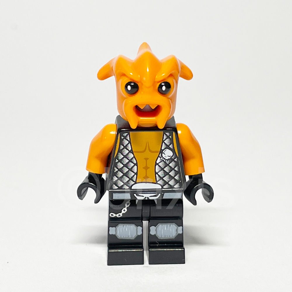 Die Gestaltung der Space Police 3 Alien Minifigur ist besonders auffällig. Der schwarze Torso ist mit einer Bedruckung versehen, die orangefarbene Haut und eine offene schwarze Weste zeigt, was dem Alien ein markantes Erscheinungsbild verleiht. Der oranger Kopf ist mit einem modifizierten Design ausgestattet, das ein offenes Maul und schwarze Augen zeigt, inspiriert von den Charakteren Kranxx und Rench. Die schwarzen Hüften und Beine sind mit einem hellgrauen Gürtel und Knieschonern, einer weißen Totenkopfschnalle und einem silbernen Kettenmuster verziert, was die Figur zu einem echten Hingucker macht.