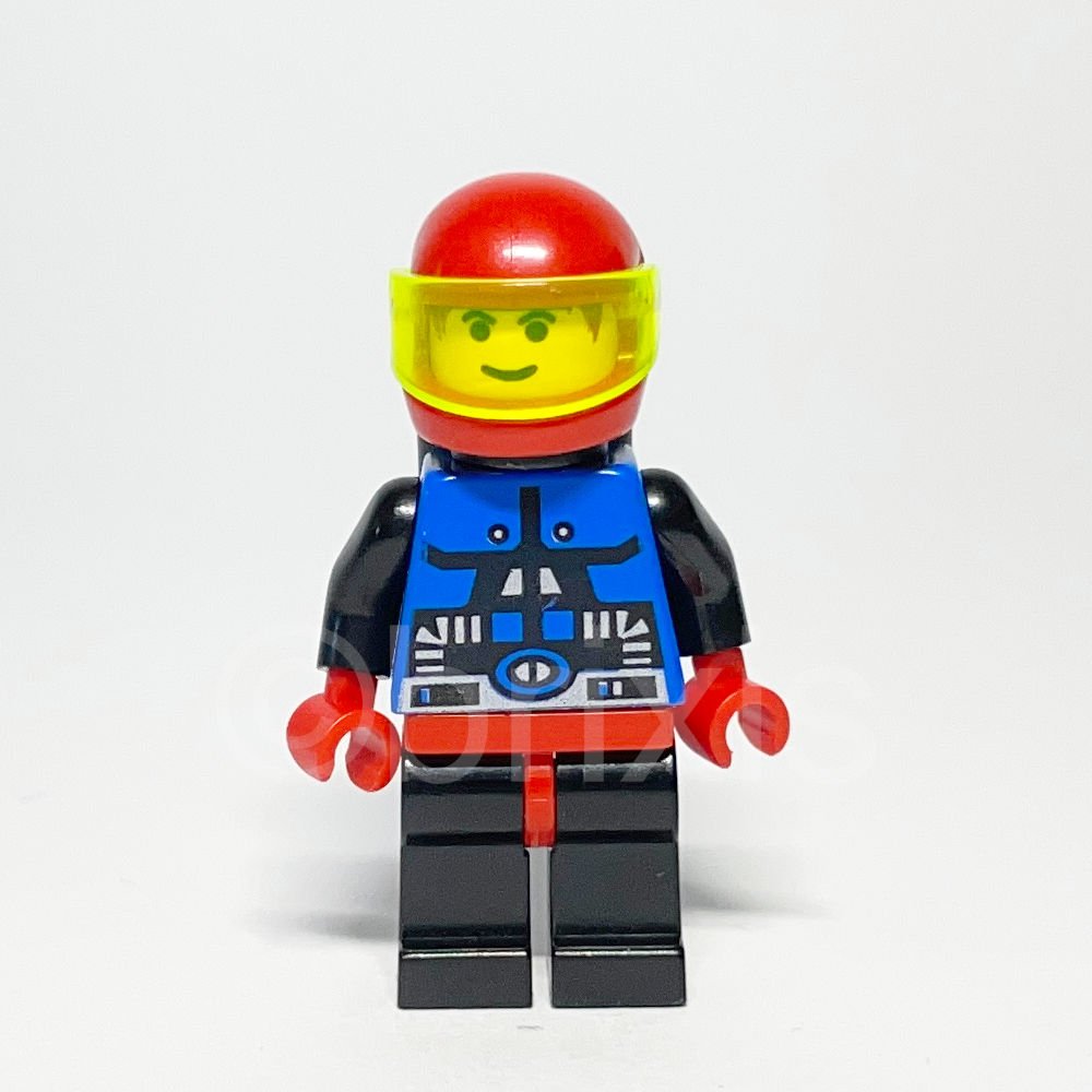 Die LEGO Space Minifigur Spyrius (SP039) gehört zur Themenwelt Space und erschien erstmals 1994 in mehreren LEGO Space Sets. Die Figur trägt einen blauen Torso mit Space-Spyrius-Bedruckung, schwarze Arme und rote Hände, ergänzt durch einen roten Motorradhelm und schwarze Lufttanks.