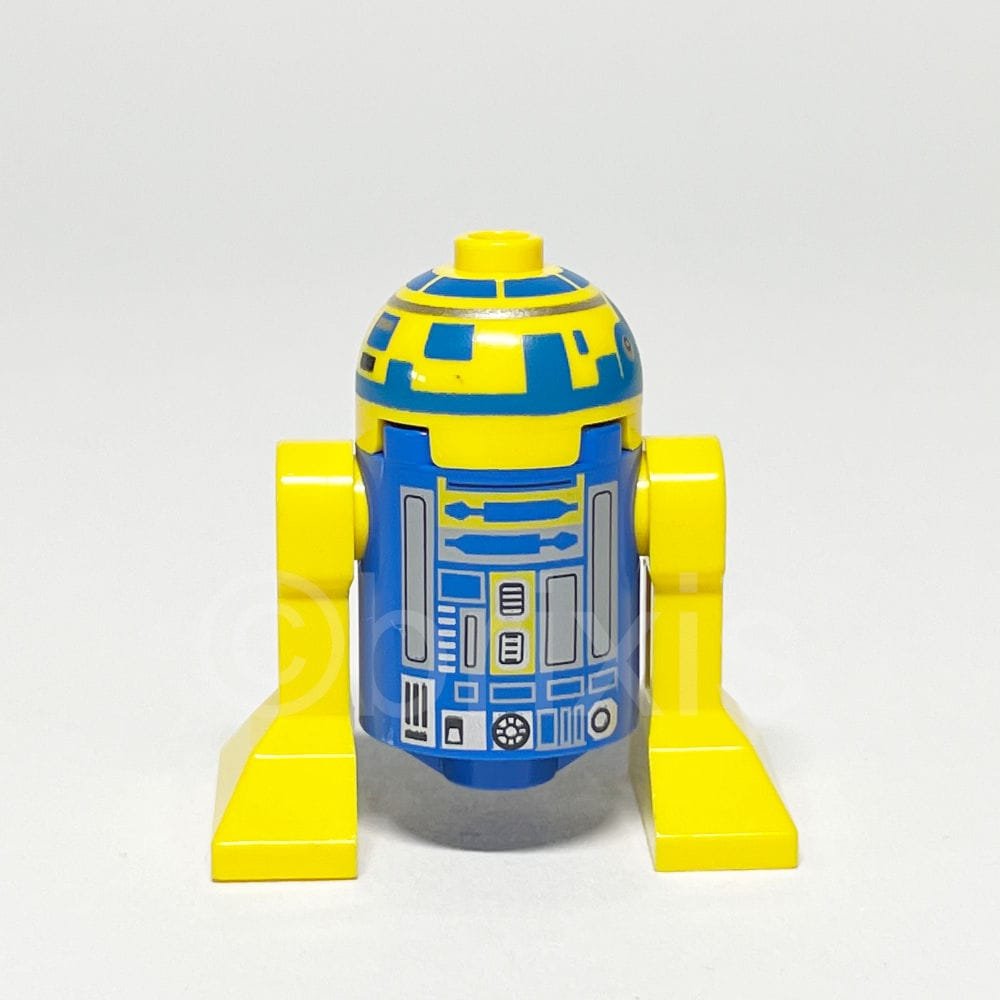- Gelbe, runde Kuppel als Kopf einer Minifigur mit blauen und silbernen Drucken, die das charakteristische Design eines Star Wars New Republic Astromech Droid darstellen
