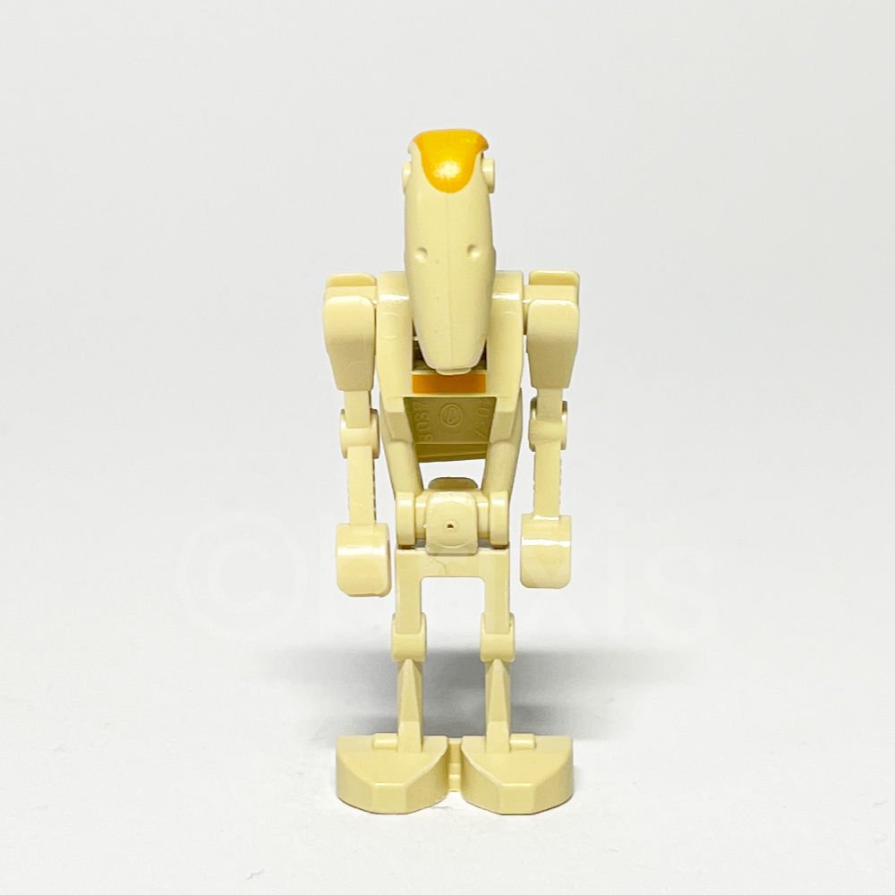 - Kopf: Beiger Kopf mit mechanischer Form und orangefarbenem Abzeichenmuster, der als markantes Element für die LEGO Star Wars Kampfdroiden dient.