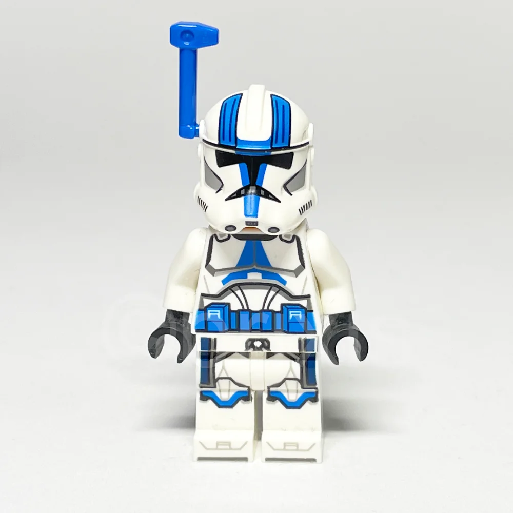 - Torso: Weißer Torso mit Klontruppler-Rüstung, blauen Markierungen der 501. Legion und einem Gürtelmuster, ergänzt durch weiße Arme und schwarze Hände.