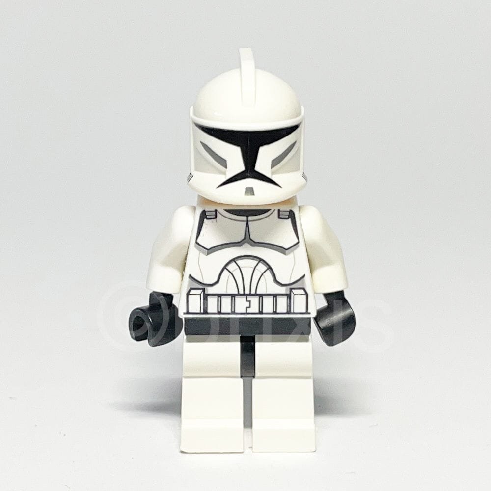 - Kopfbedeckung: Weißer Helm mit charakteristischen Löchern an den Seiten, der die markante Form eines Star Wars Clone Trooper Helms aufweist und perfekt auf den Kopf der Minifigur passt.