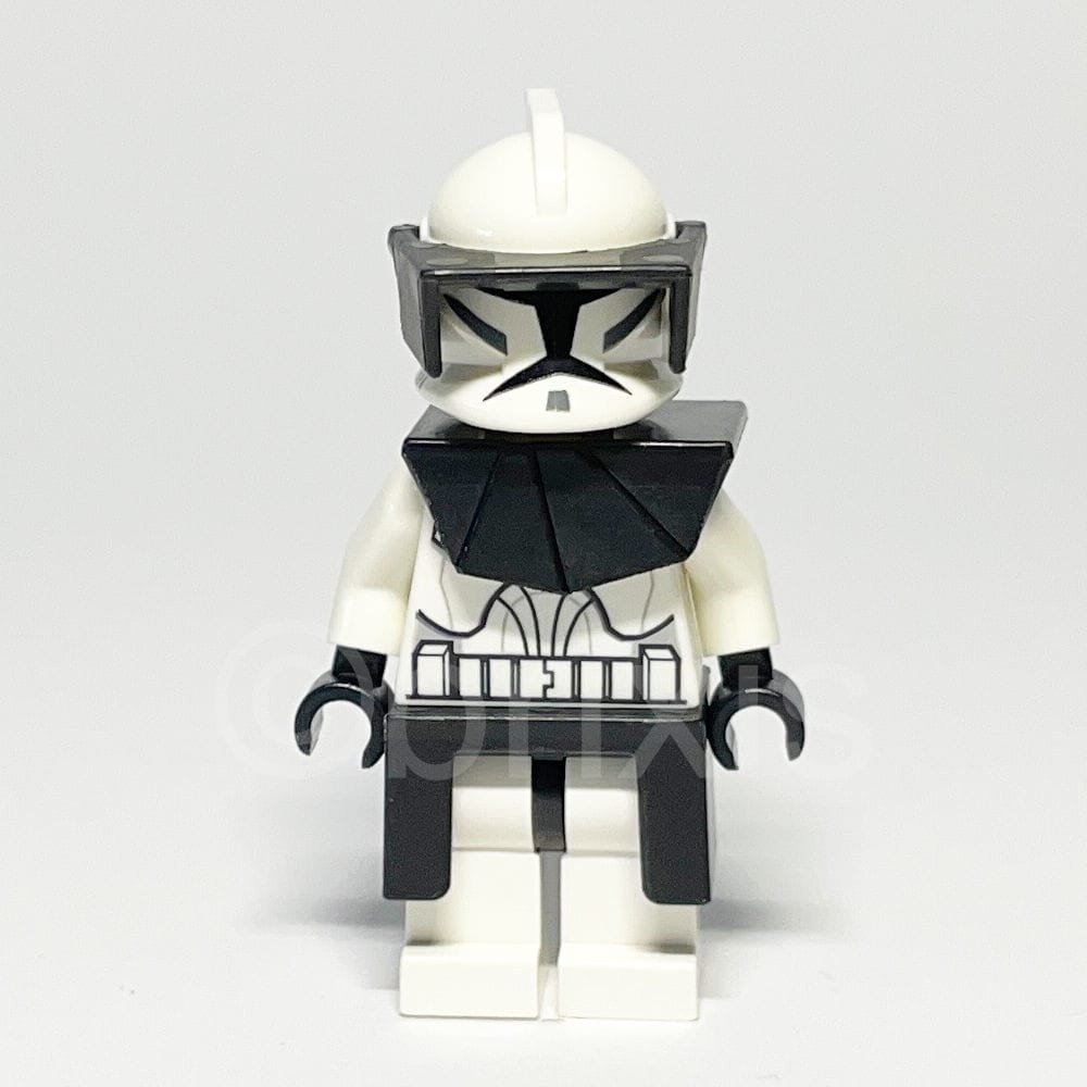 - Torso: Weißer Torso mit Klonkrieger-Rüstungsmuster zeigt detaillierte Panzerungsdrucke und wird von weißen Armen und schwarzen Händen ergänzt.
