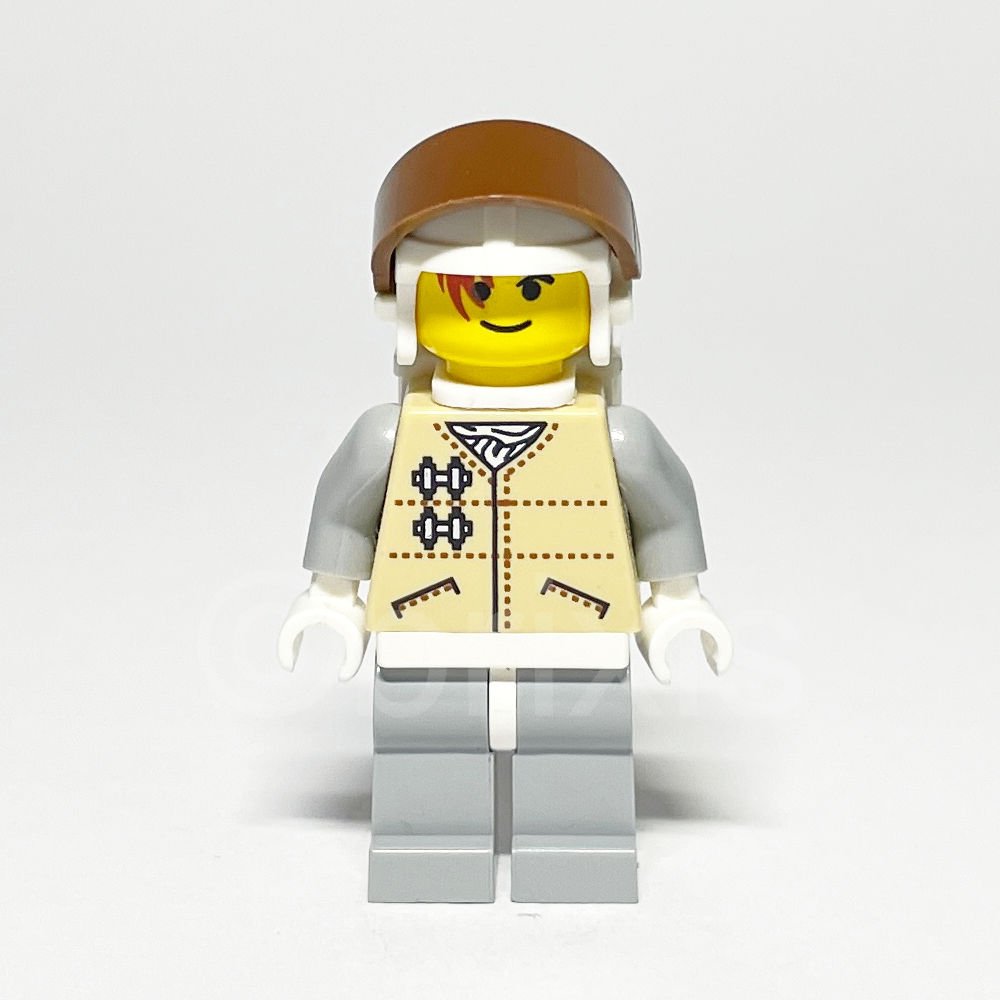 - Torso: Hellbrauner Torso mit detaillierter Hoth-Rebellenjacke, die braune gepunktete Linien und Taschen über einem weißen Schal zeigt, ergänzt durch hellgraue Arme und weiße Hände.