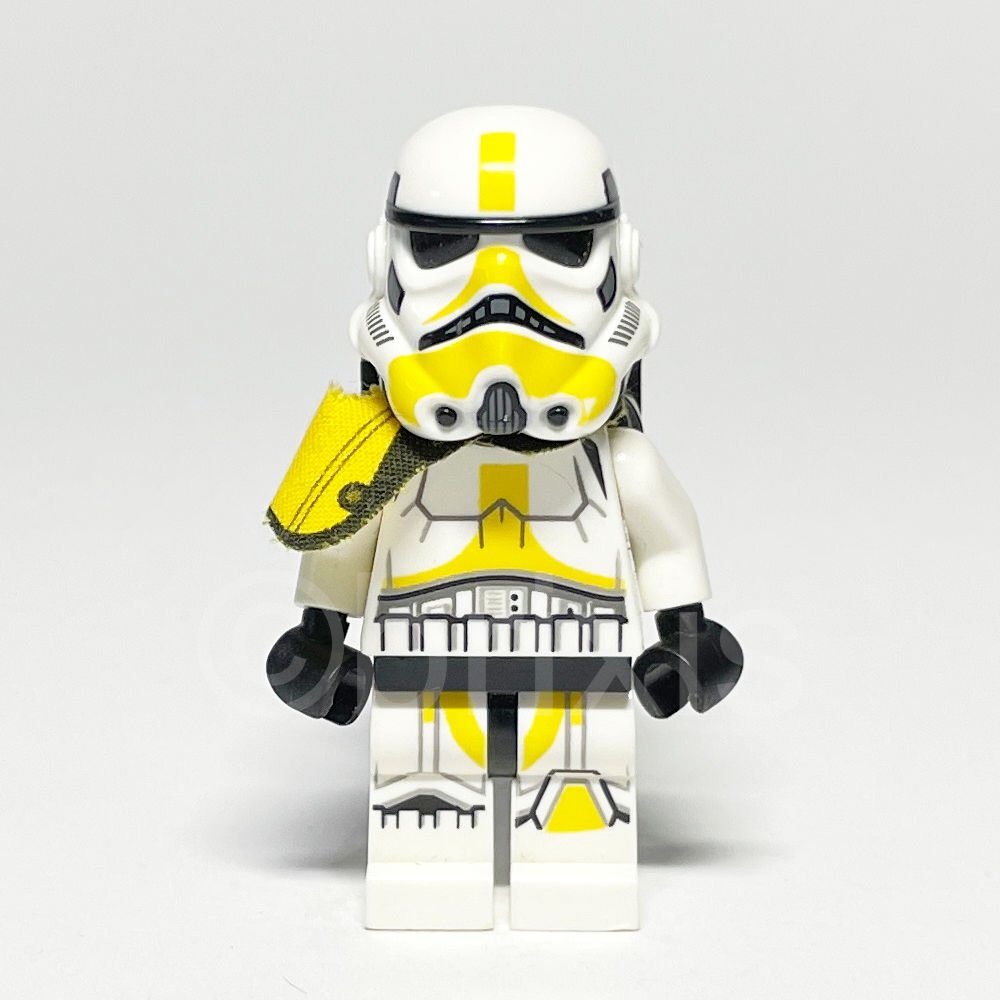 - Torso: Weißer Torso im Stormtrooper-Rüstungsdesign mit detaillierten gelben Markierungen, ohne Schultergurte, und einem schwarzen Rucksack mit weißen Zylindern auf der Rückseite, ergänzt durch weiße Arme und schwarze Hände.